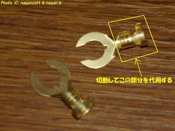 ワイヤーをリンクするスリーブ金具を持ってないので、自動車の伝送ハーネス作成するときに用いるギボシを切断して流用します。