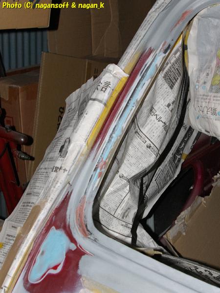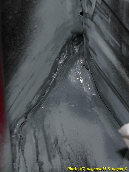 リヤガラスはめ合い部左下角の鉄板裏側、つまりエンジンルーム内とピラー内へジンクスプレーを吹きました。