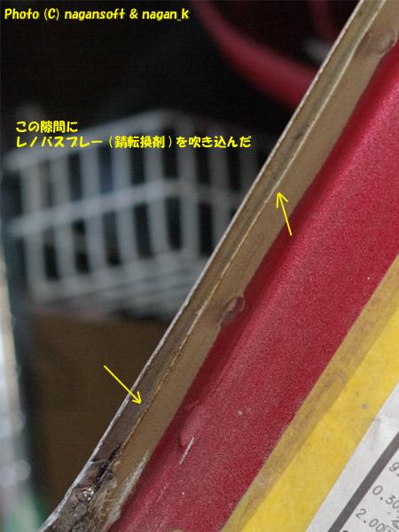 その合わせ部分隙間へレノバスプレー(錆転換剤)を吹き込みました。