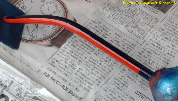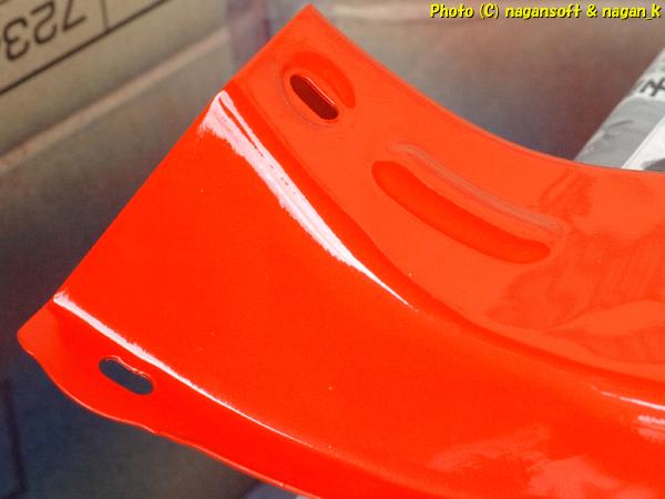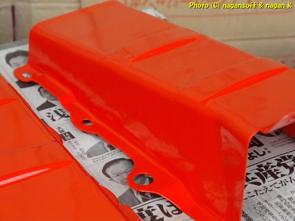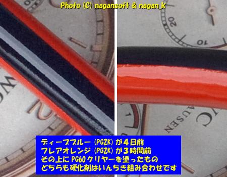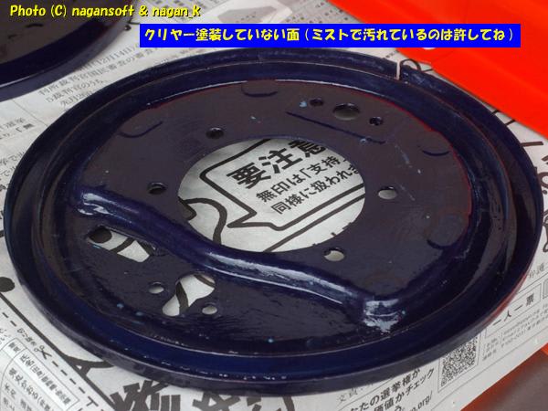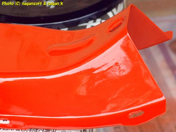 ディープブルーが4日前、フレアオレンジが3時間前に塗装という状態で、クリヤーをトップコートしてます。
