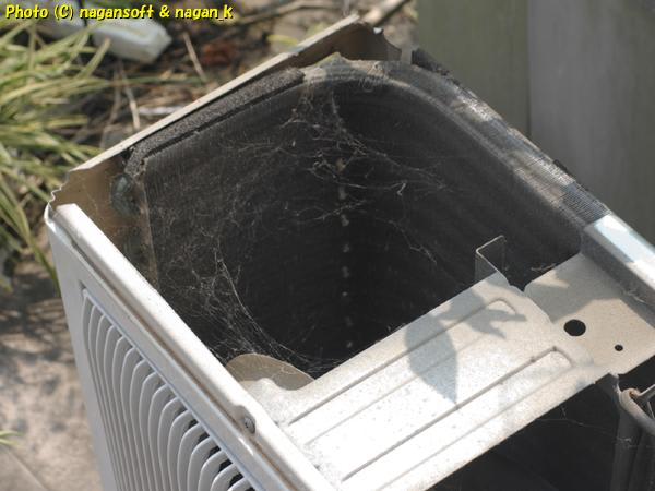 そうそう、今回は、クモさんが室外機の中に不法占拠してました。