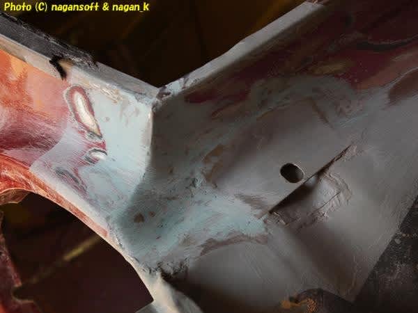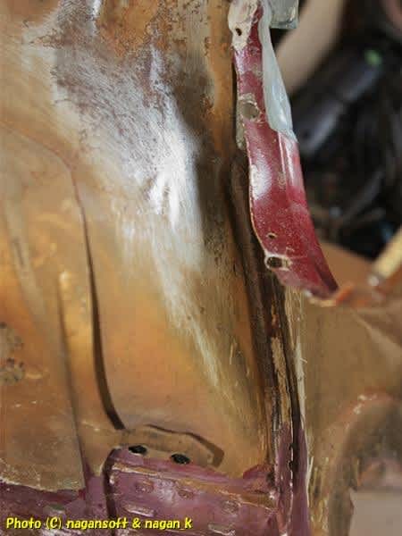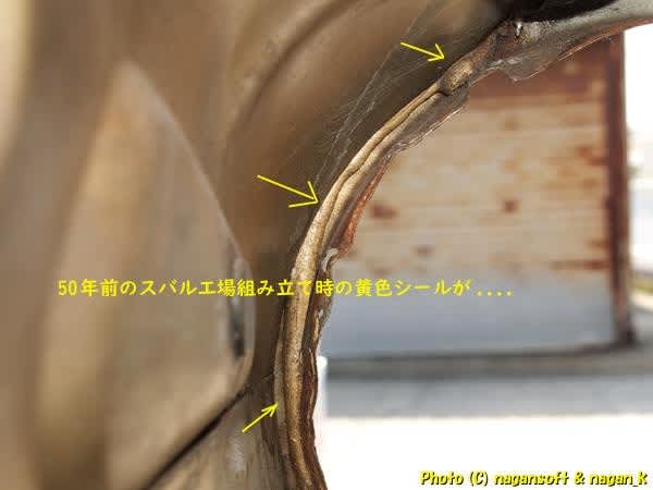 フェンダーエプロンとフロントパネル合わせ部分に、スバル工場で組み立てられたときに黄色いシールが入れられているんです。