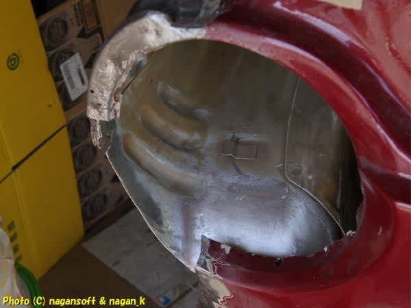 えーと、取り付けヒース名をつけるとしたら、右フェンダーエプロンのヘッドライト縁部分になります。フロントパネルとのノリシロになる部分です。