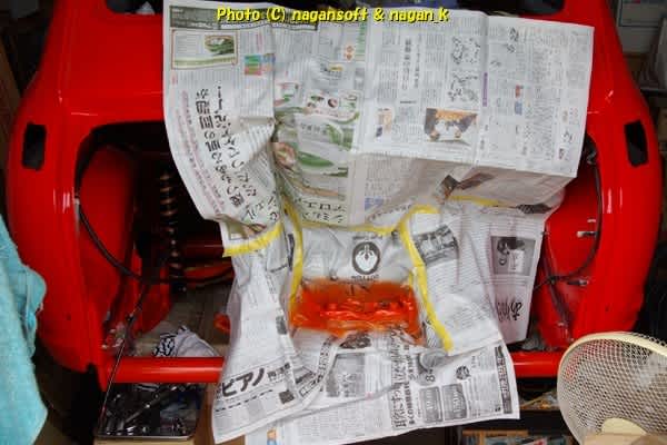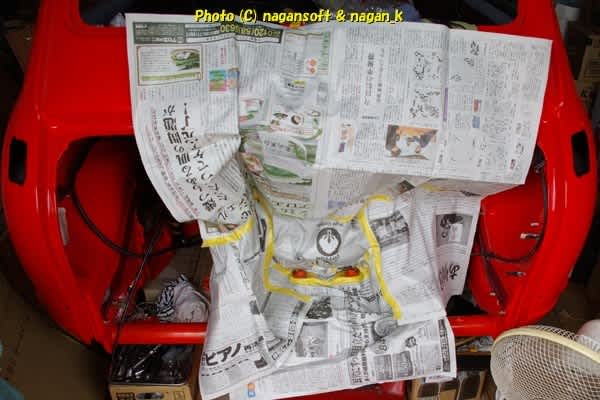 わかったよ、新聞貼り付けるよ。って、R-2の大きいお尻にオシメを貼り付けます。