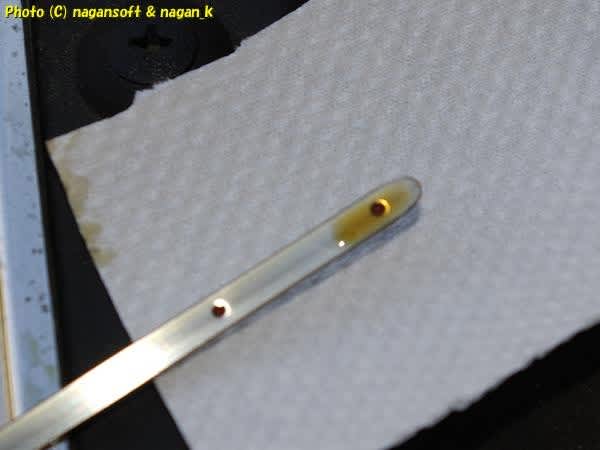レベルゲージのオイルをキッチンペーパーで拭き取ってみます。
