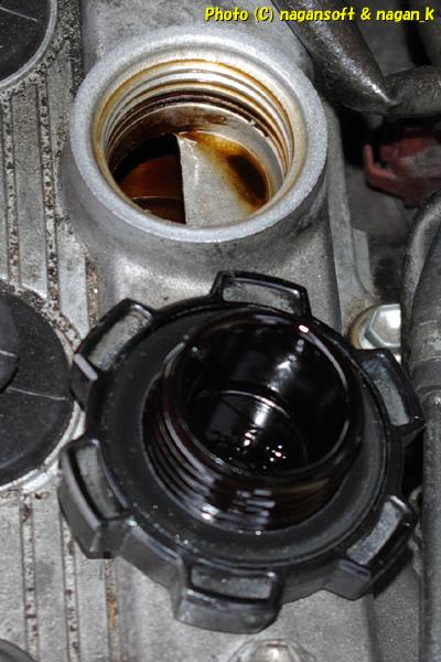 エンジンオイルの色を見るべくオイルフィラーキャップを開けます。
