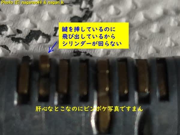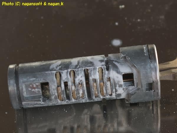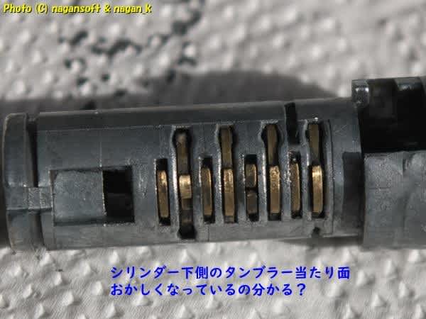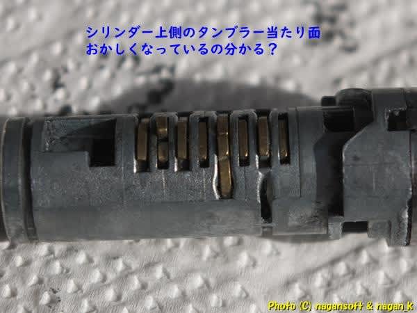 鍵を差し込んたときに鍵溝に合わせてピコピコと飛び出す部品があるのですが、それをタンブラーといいます。そのタンブラーが当たるところはガタガタに欠けています。