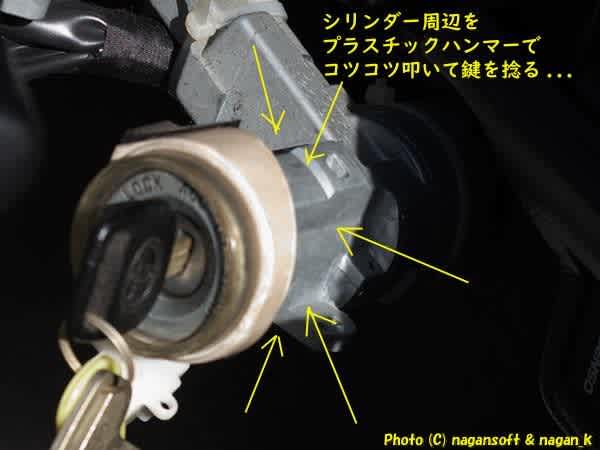 プラスチックハンマーでコツコツと叩いて振動をキーシリンダー周辺あちこちに与えてみる。