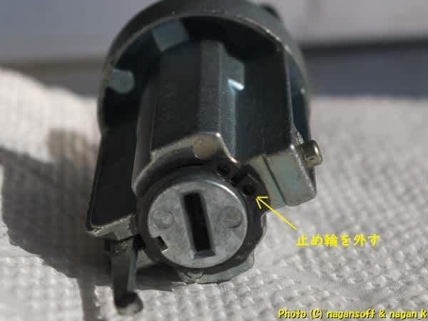 キーシリンダー後ろに止め輪があるので、それを外してキーシリンダーを外筒と中筒に分解です。