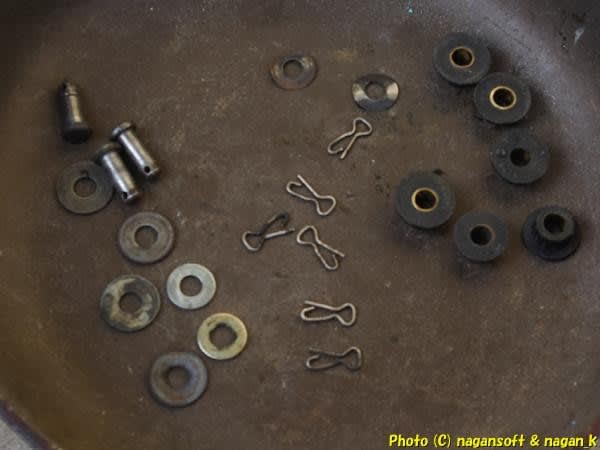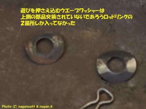 隙間から手を入れて部品を外していくのですが、1本のロッドが隙間のずーっと奥で取りはずのに苦戦したんです。その苦戦してロッド両端のリンク部分は部品が揃ってました。それ以外のそんなに苦戦せずに手が届くリンク部分は遊び押さえのウェーブワッシャーが入ってなかったのです。
