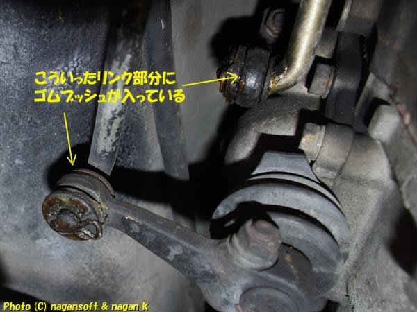 その棒が接続している部分に緩衝材としてゴムブッシュが挟まっているのですが、そりゃーシフト操作する度にガチャガチャと擦れるわけでゴムが痩せていくのよね。