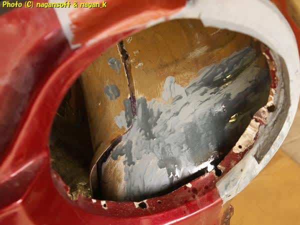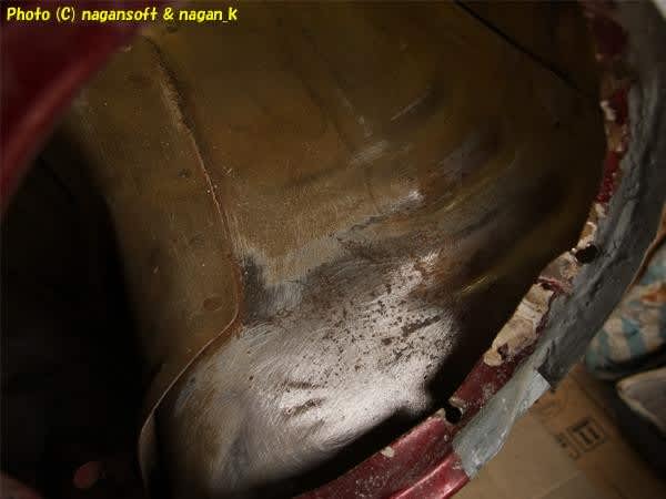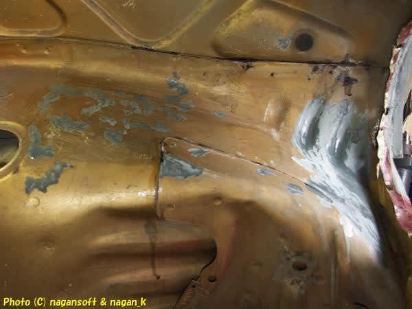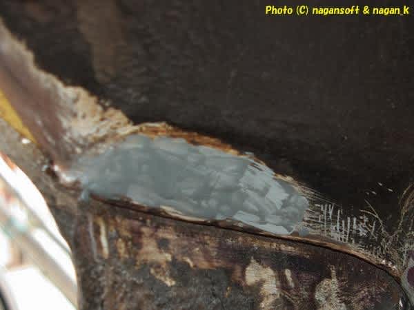 ってことで、リューター刃先が届かない隙間に錆転換剤(レノバスプレー)を吹き込みました。鉄肌露出で次の作業に影響なさそうな部分は、錆止め塗料(エポローバル)をペタペタと筆で乗せておきました。
