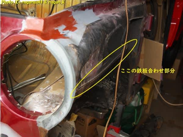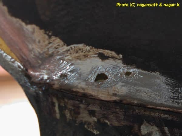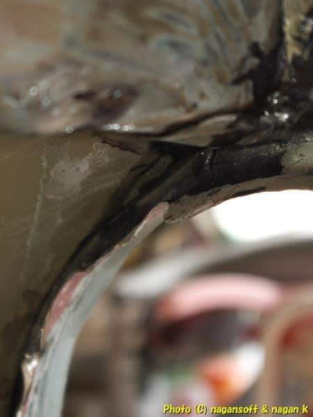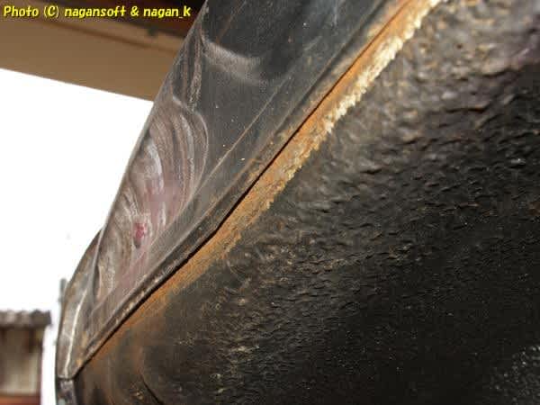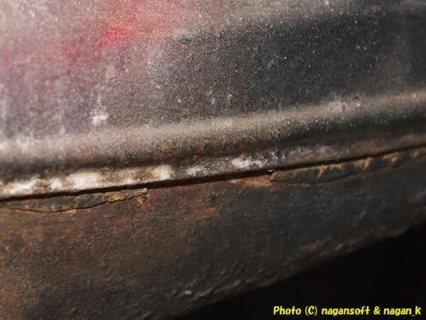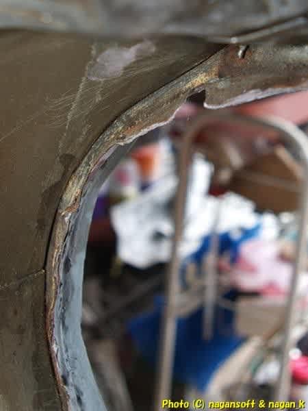 すると、フェンダー側面の鉄板合わせ部分に小さい錆穴貫通です。