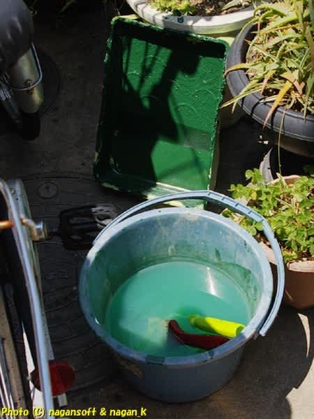さてさて、塗り終えて道具を片づけ掃除しているときに、刷毛がバケツから脱走して床を汚しちゃいました。