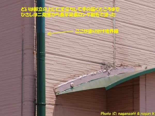 先週は、玄関ひさしを主体にした、外壁に貼りついているひさしと、正面玄関面の両サイドにある樋の塗装をしました。