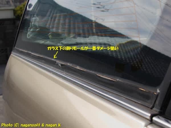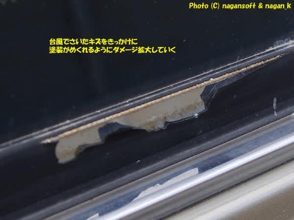 台風直後はハッチバックのところのような砂利つぶてでついたキズだったのですが、この部分は雨水ダメージが大きいのでしょう。