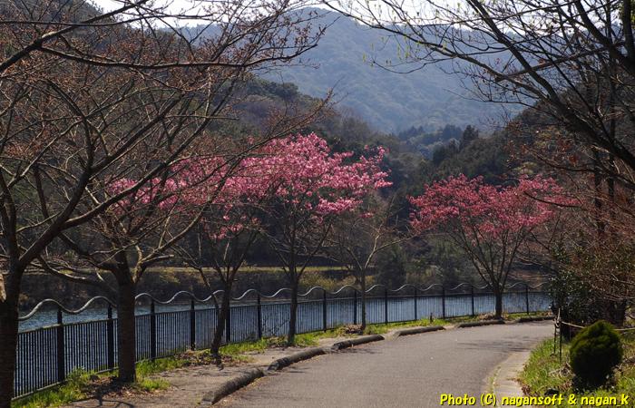 池の周りに桜が植わっているのですが、どうも遠い場所に3本ぐらいピンク色のものがあります。