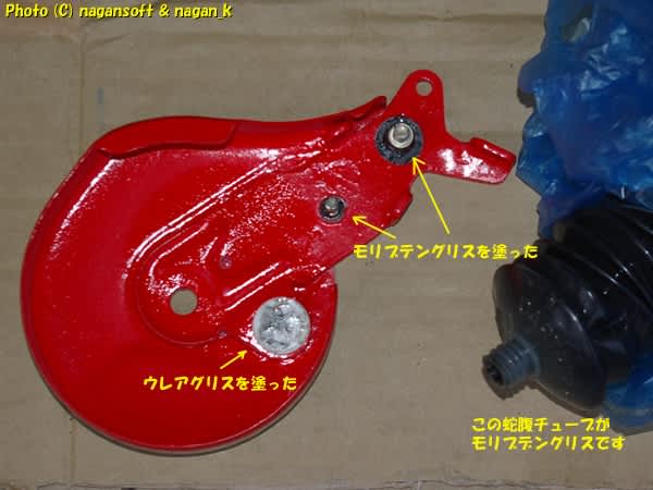 横に一緒に写っているスプレー缶は、ウレアグリスです。写真には写ってませんが、このグリスとは別にモリプテングリスも用いました。