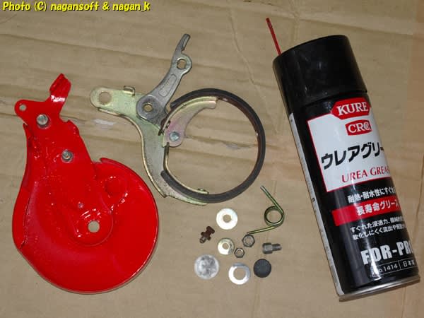 バラバラにしたリヤブレーキの部品です。この構成部品は午前中に後半がアクセクしているのをほっといて玄関先でパーツクリーナーでシコシコと私が磨いたのです。