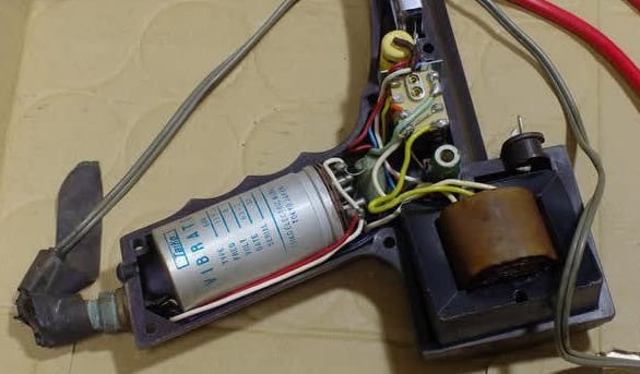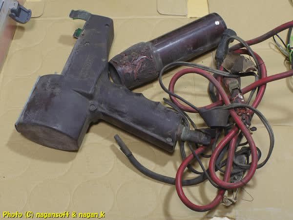 ガンの根本については電源線を保護する目的でなにかブーツを貼り付けていたのでは、今までのガラクタ修理品を見てきた傾向を考えると、きっと車体から取り外した破れたシャフトブーツとかを流用素材にして液体ガスケットで巻きつけて補修していたのではと推論です。
