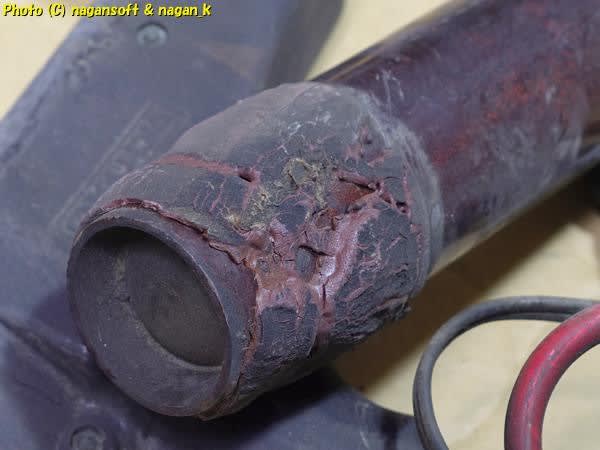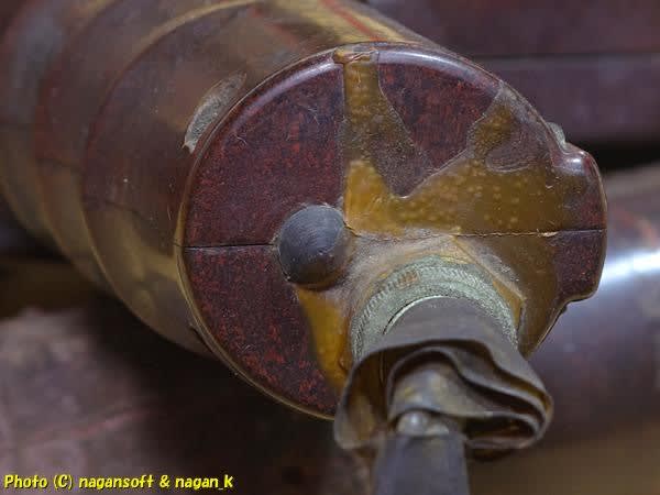 ランプ先端部を保護するためと思われる、きっとゴムだったであろう素材は、カチコチの油の抜けたブラ系樹脂のようなものに変化しています。