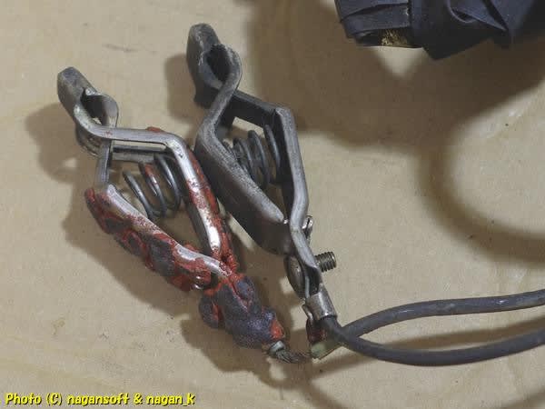 電源線のバッテリー接続側のクリップを取り外して掃除して状態確認です。