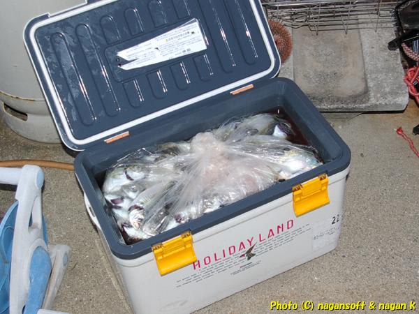 22リッターのクーラーに水氷を仕込んで首を折ったアジが満載です。魚が7割残りが水氷という密度です。