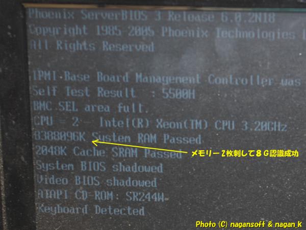 このサーバーはメモリースロットが8本あるので残りに元からついていた1Gのメモリーも突っ込んでみましたが、それだと起動しません。ちなみにこのサーバ機は16Gが最大メモリーです。