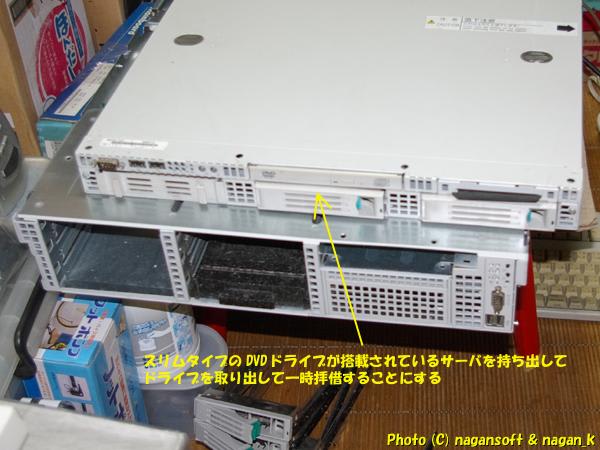 ということで、仕事で運用しているサーバ機達から、DVDスリムドライブが搭載された機種を引っ張りだしまして、一時的にDVDスリムドライブを拝借です。