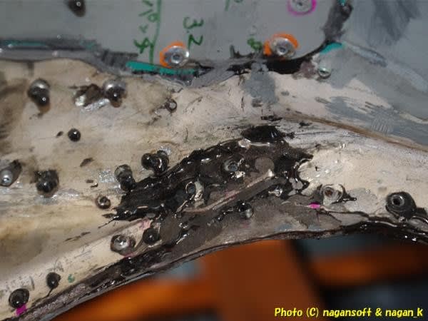 でもなー、シーリングの表面は柔らかいんだよなー。塗装乗せてもシーリング箇所はやわらかいんだよなー。車検のときに検査官が打検したら鉄の音がしないぞって物言いが始まるよなー。検査官ってパテ盛りとシーリーングごまかししているところはめざとく見つけるっていうしなー。