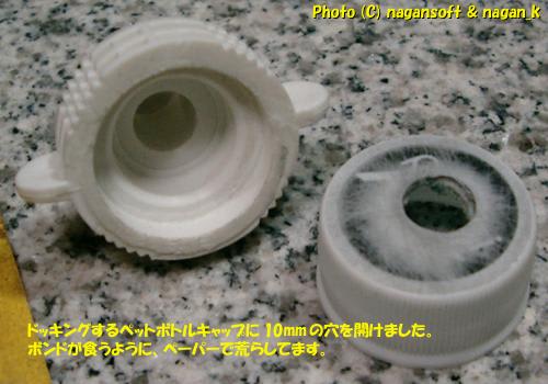 水道ワンタッチカプラのオス側出口の大きさが9mmでしたので、それよりちょっと大き目の穴を開けようかと思い、12mmでペットボトルキャップに穴開けしました。