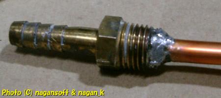 ハンダ部分にエア漏れがないか、金属パイプの先を手のひらで塞いで、その反対側から息を吹きこんでみます。