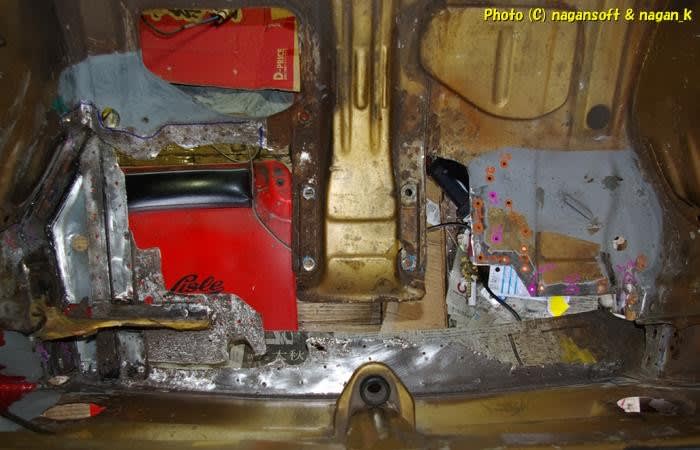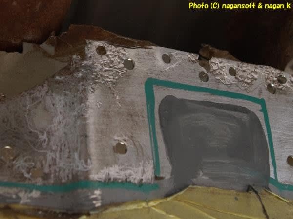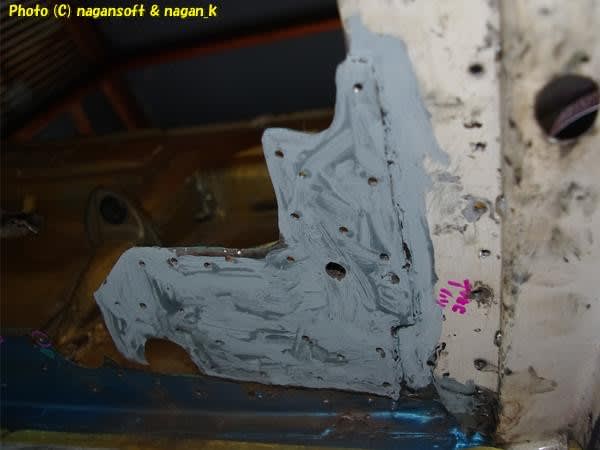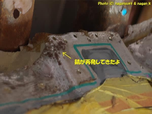 痴呆親父が構築している補強梁部分。それの裏側(トランク床裏になります)も錆取り追求しました。ここはバネルボンド糊シロではないので錆止塗料(エポローバル)を筆塗りします。