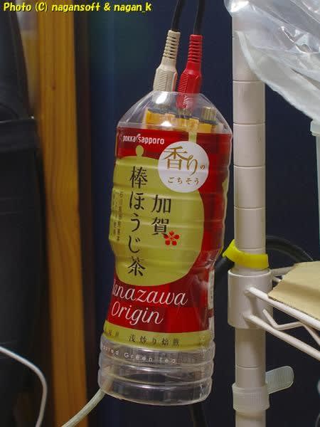 ケーブルにぶら下がる形でペットボトルを固定してます。
