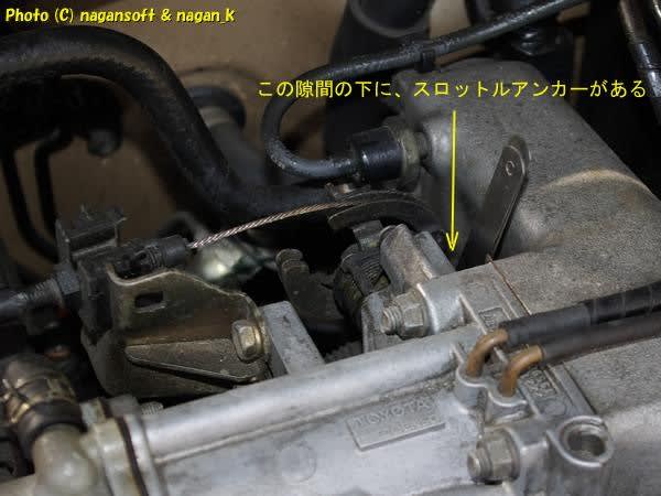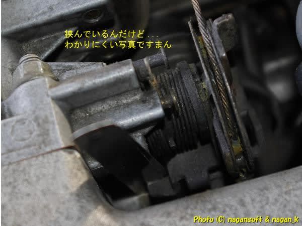 それをスロットルワイヤーを引っ張って、スロットルストップアンカーの隙間に挟みます。