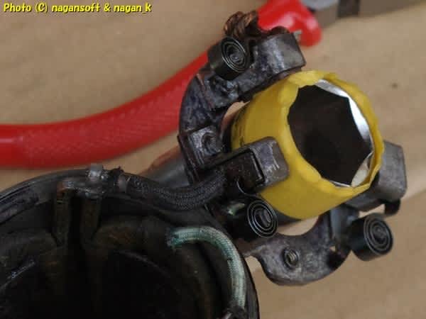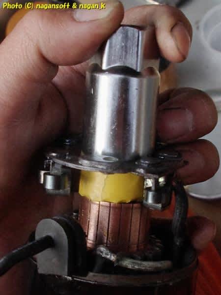 ソケットレンチをブラシ当り面先端に当てて固定します。ゆっくりとブラシホルダーを送り込むのですが、2本の手だとプチ苦戦してます。アグラかいて愚息にセルモーターの端っこを押し当てて、両手でやさしく送り込みって、これってまるでコンド…。ちょっとだけ自主規制表現モード発動。