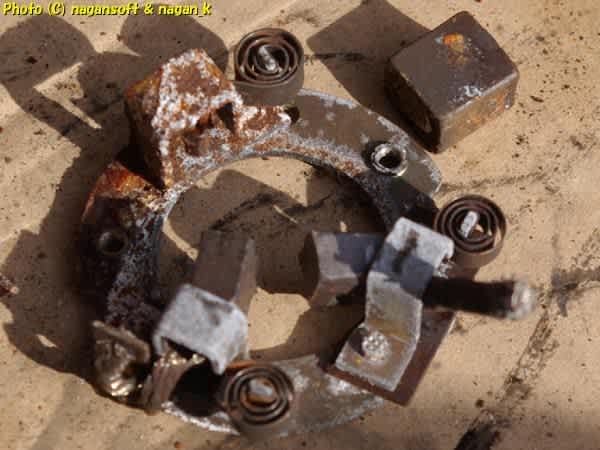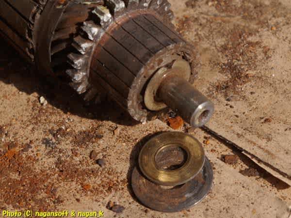 フライホイルに食いつくギア部分です。逆転防止クラッチ機構も組み込まれているのですが、もはや可動しないワビサビ造型彫刻と化してます。
