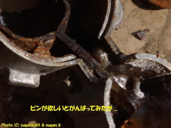 とうとうピンの頭が叩き潰れました。ピン自体はとってもしっかりしてました。しかし錆で膨らんだ轡の呪縛から開放されずに自滅してしまいました。くそー、ピンが欲しかったのに。