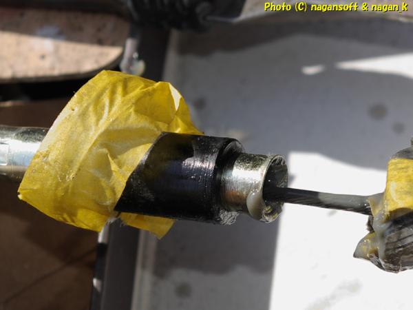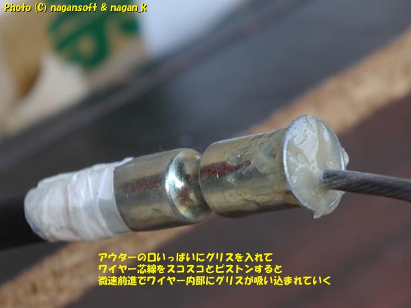 アウター口に一杯までグリスを入れまして、ワイヤーを持って立ち上がり(重力の力を借りるため)、ゆっくりと芯線を動かしたら微速前進でグリスが吸い込まれていくのを発見です。