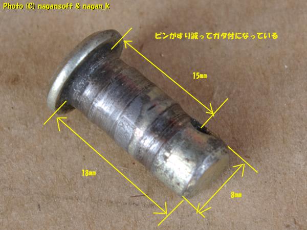 念のために採寸です。直径8mmで片側だけ頭があり、軸部分長さが18mm、Rピン通し位置が15mmでした。