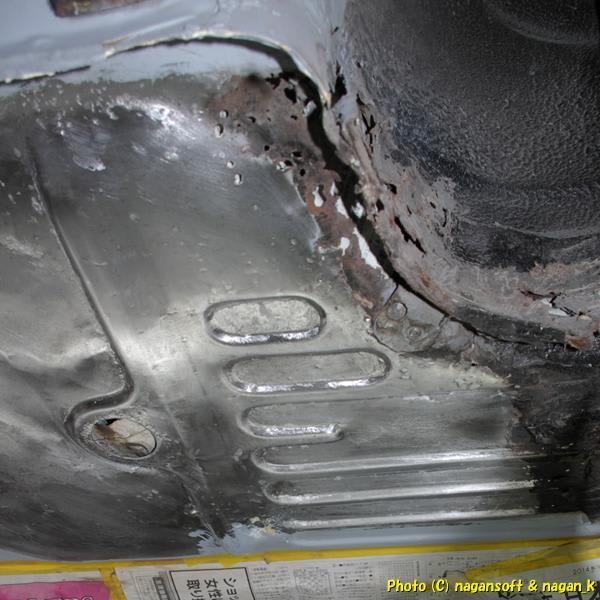 まずは、運転席床裏にジンクスプレーを吹きました。