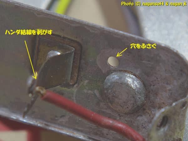 具体的にはランプ取り付け部分にハンダ結線していたところを剥がすのと、ケーブルを通すために開けていた穴を塞ぎます。