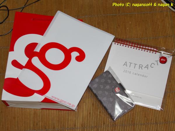 gooの紙袋、gooのクリアファイル、gooの卓上カレンダー、多分スマホのカバー?