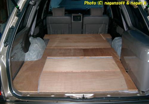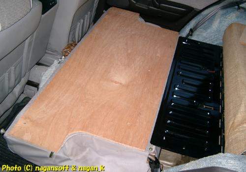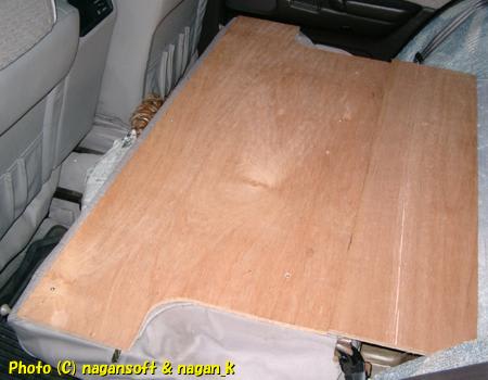 その対策で、リアシート背もたれにコンパネを貼りつけできるように、正月休みの作業では裁断済みです。