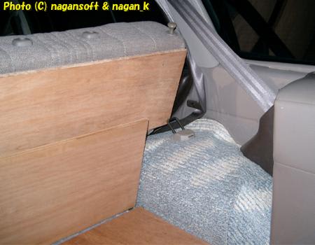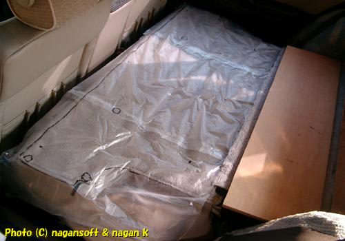 ということで、いよいよリアシート背もたれ裏のコンパネ貼り付け作業をした次第です。