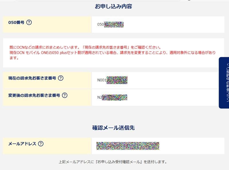 新しいOCN契約番号で、050プラスONE音声SIM契約 (OCN光モバイル割適用)