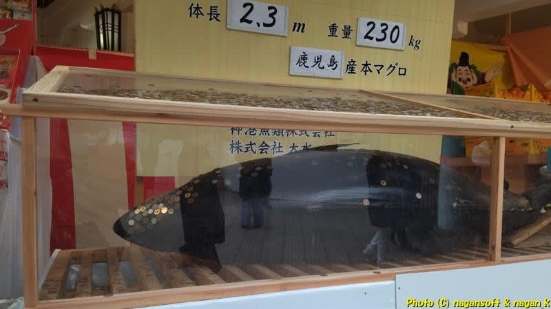 えべっさんを笑わせる大きい願いをしながら儲かった企業が奉納したマグロに日銭を貼り付けて便乗してえべっさんに願いを届けるのだー。