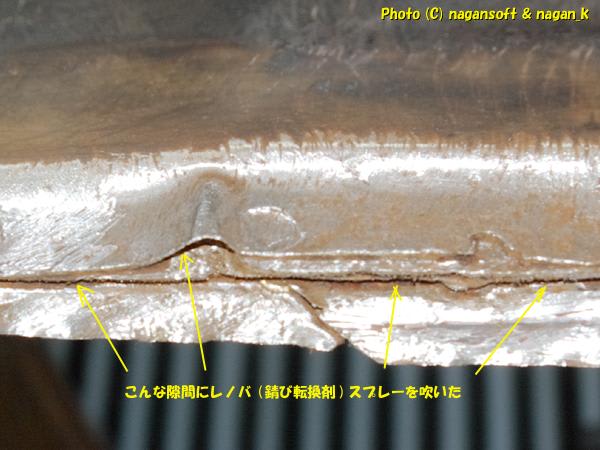 このタイミングで鉄板合わせ部分の奥に向かって錆転換剤処置をしておこうと思います。
