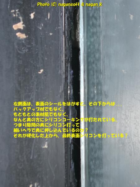ところがバックアップ材がなかったところは、ずっと奥までシリコンコーキングが流れており3面接着、ないしは、奥が極端に太っているシリコン肉厚仕上げになってます。