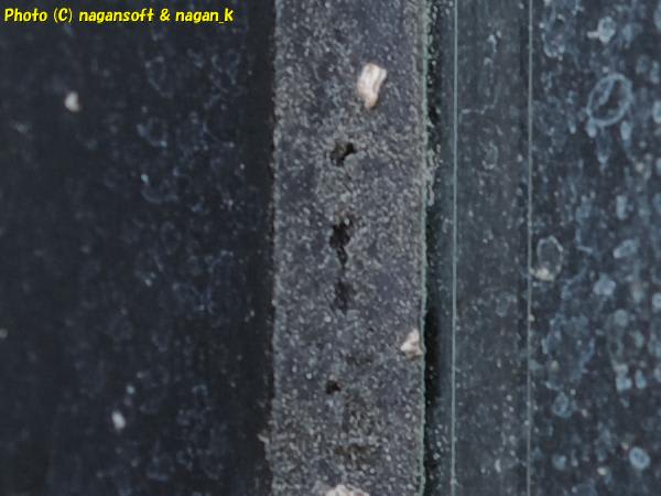 シリコンシールが施されているのですが、ヒビが入って裂けるように朽ちていくのではなく、なにやら中から噴き出したような穴が開いているのです。